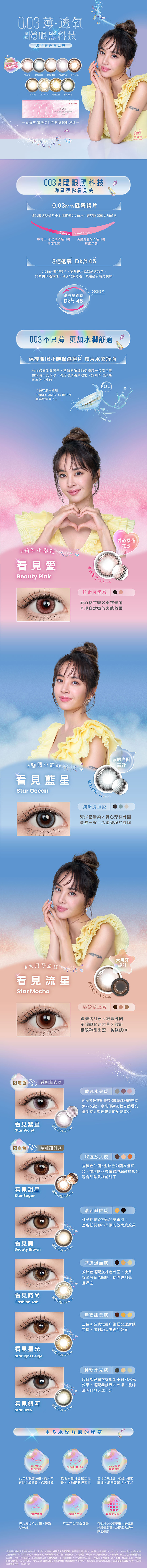 COLOR CONTACT LENS 彩色鏡片 透明鏡片 日拋 月拋 彩色鏡片 日拋 月拋 保養液 軟式隱形眼鏡專用 硬式隱形眼鏡專用 潤濕液 緩衝液 10枚入 零零三 薄 透氧彩色日拋隱形眼鏡 Air Light Daily Color Contact Lens TWD. 320 產品規格 直徑 14.2mm 含水量 38% 基弧 8.7mm 光度 0.00,-1.00~-10.00(-1.00~-6.00每0.25一級,-6.00以上每0.5一級) 顏色 看見愛、看見藍星、看見流星、看見紫星、看見甜星、看見美、看見時尚、看見星光、看見銀河 字號 衛部醫器製字第007917號 查詢銷售店家